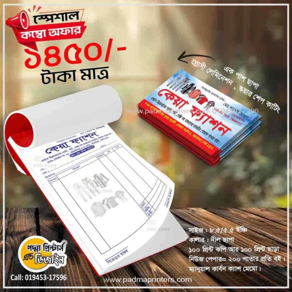 – নীল কালার ছাপা ম্যানুয়াল কার্বন ক্যাশ মেমো।